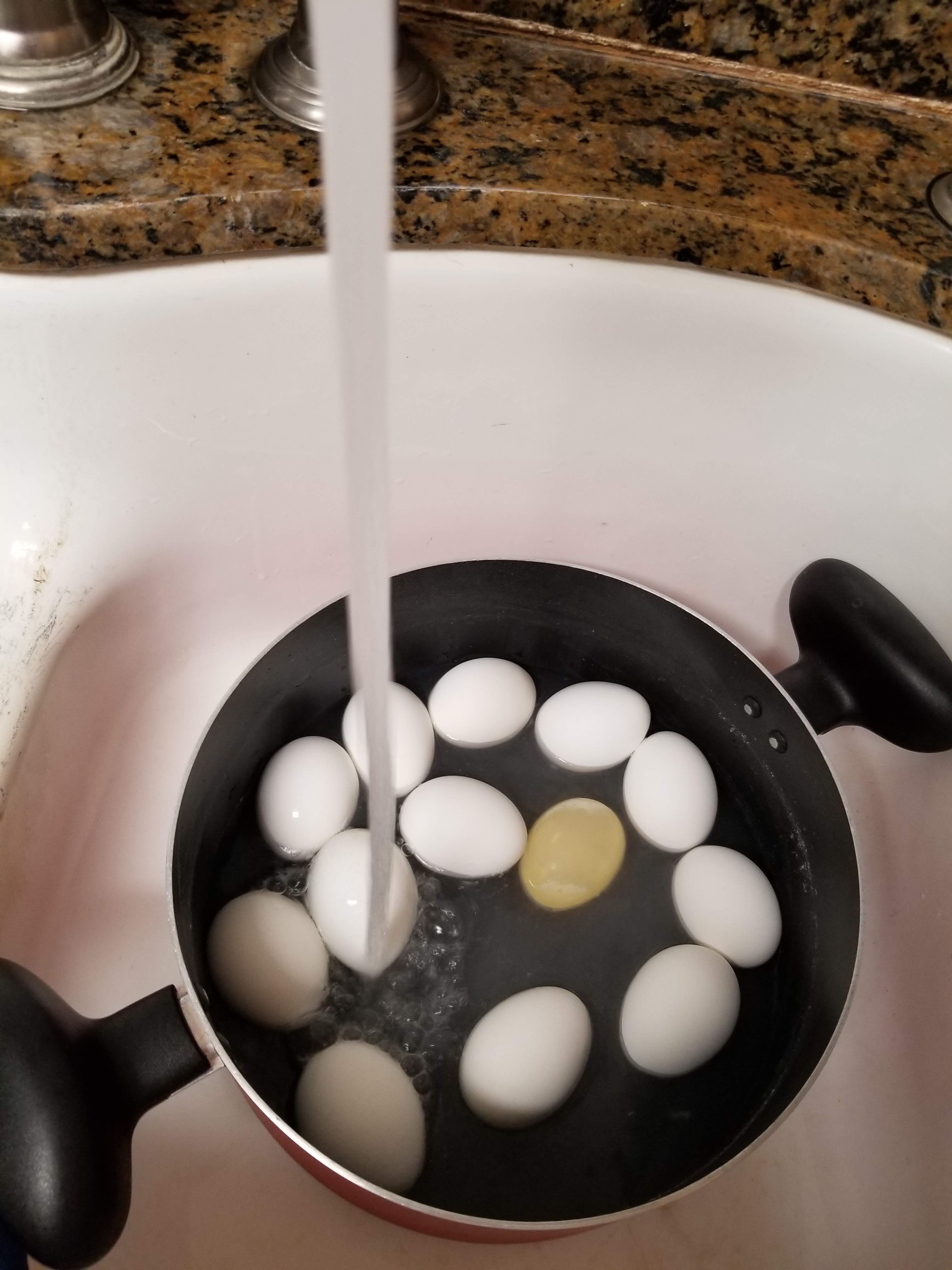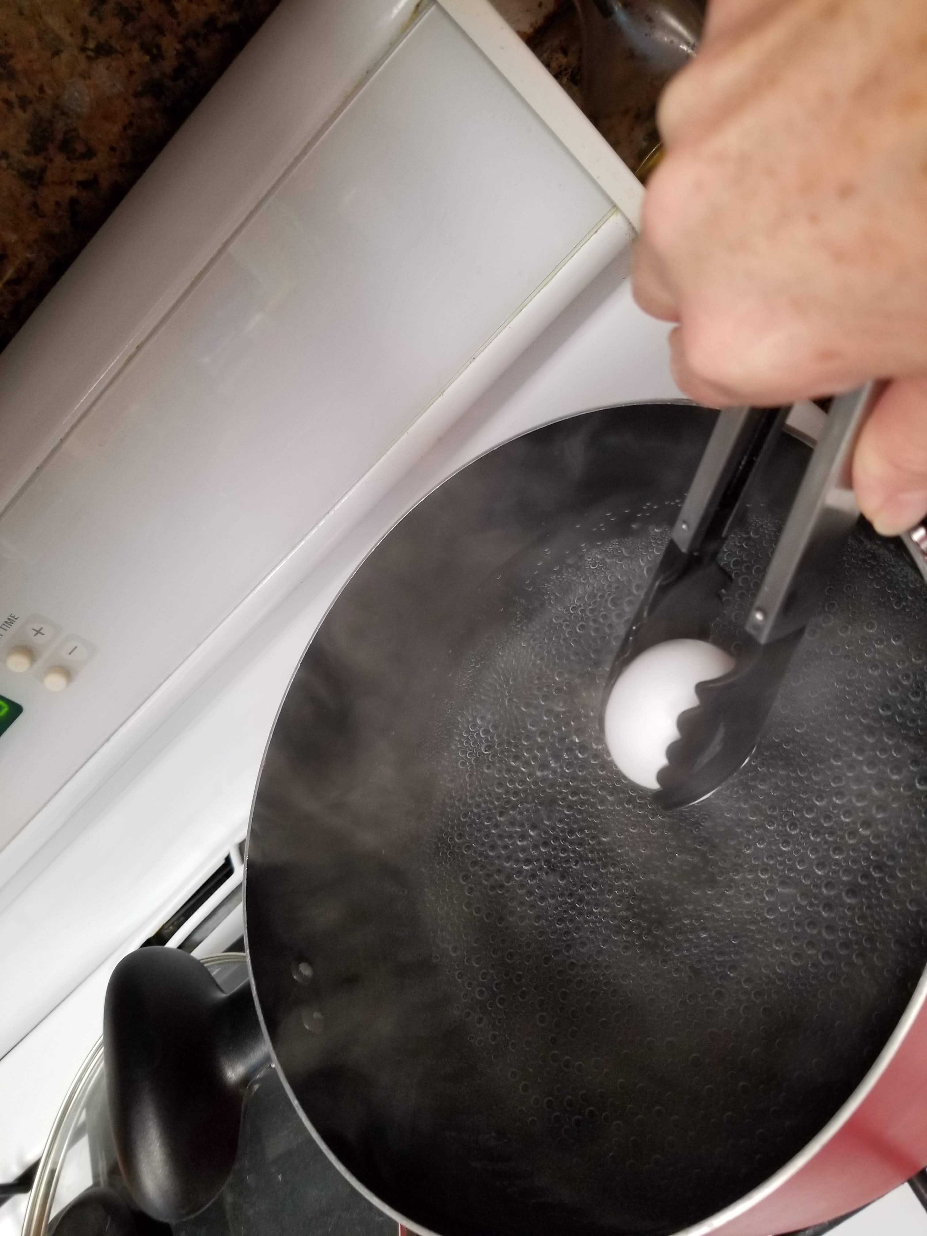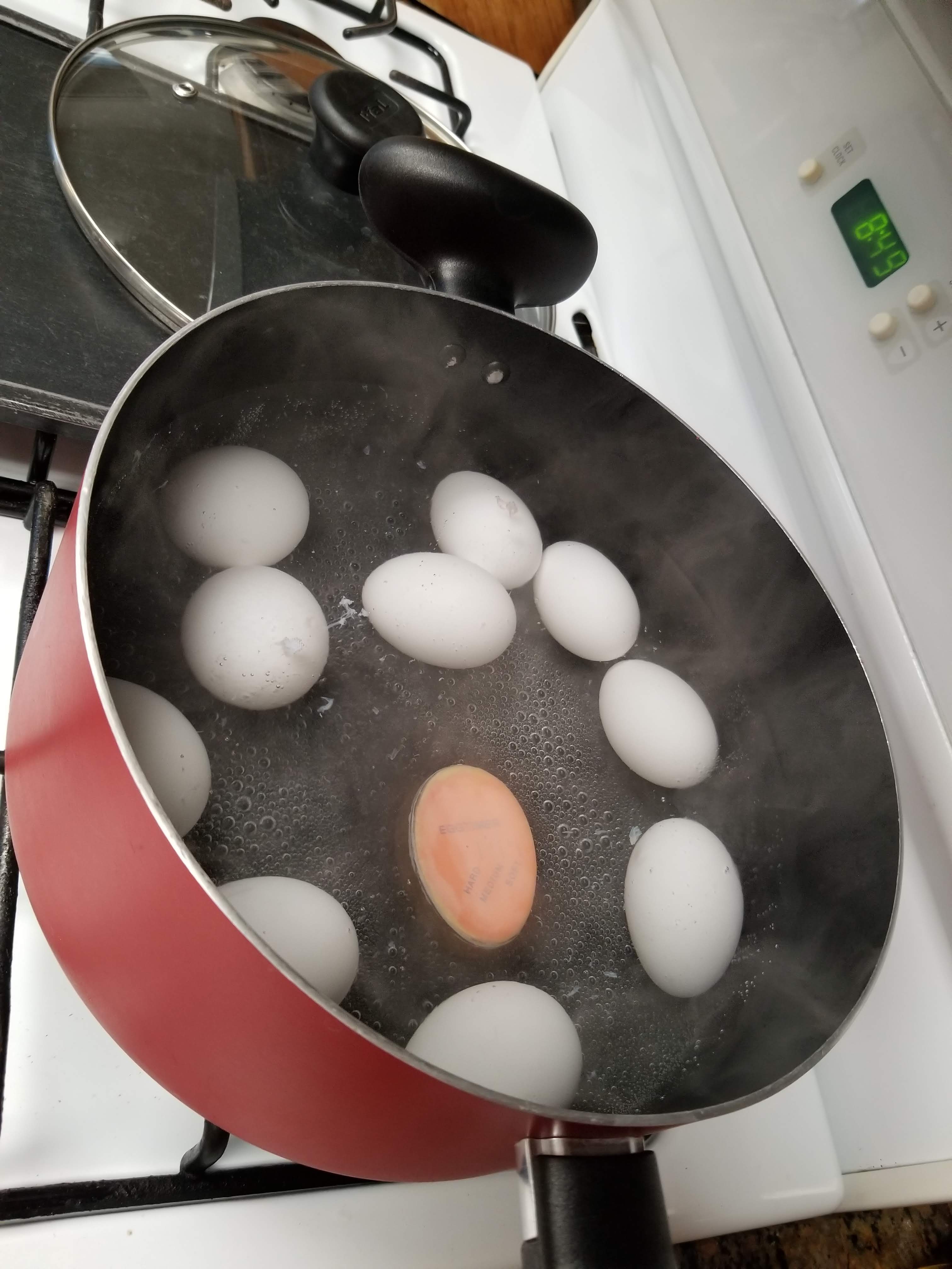 3. Once the water starts to boil you will then proceed to add in the eggs and the egg timer. If you add in eggs and they are cracked remove immediately so it doesn’t make the water messy and those eggs will not cook properly.