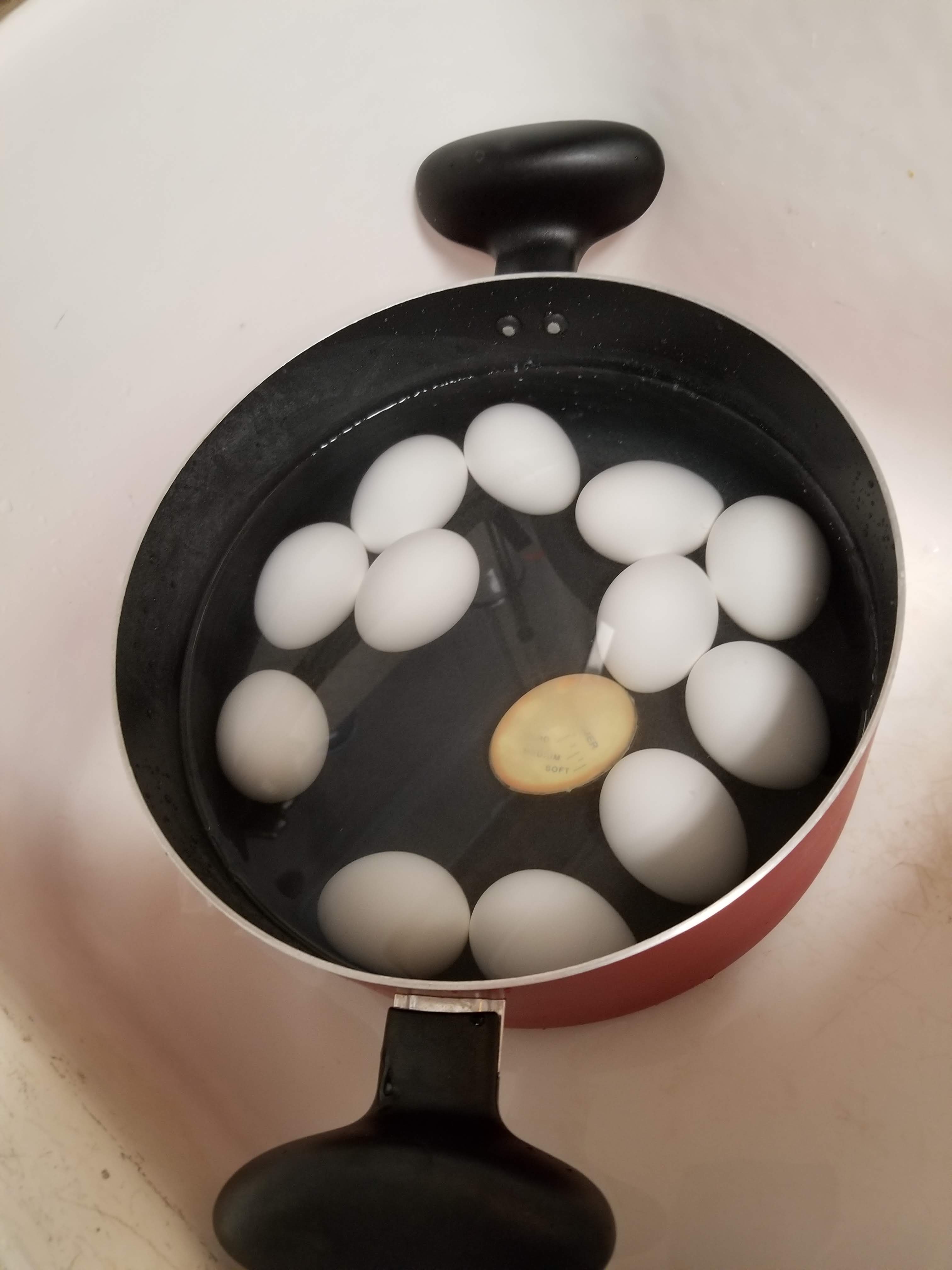 7. When the timer goes off remove from the stove and run under cold water a few times and then place in cold water to stop the cooking process and let set for about a half hour. The egg timer will start to go back to red.