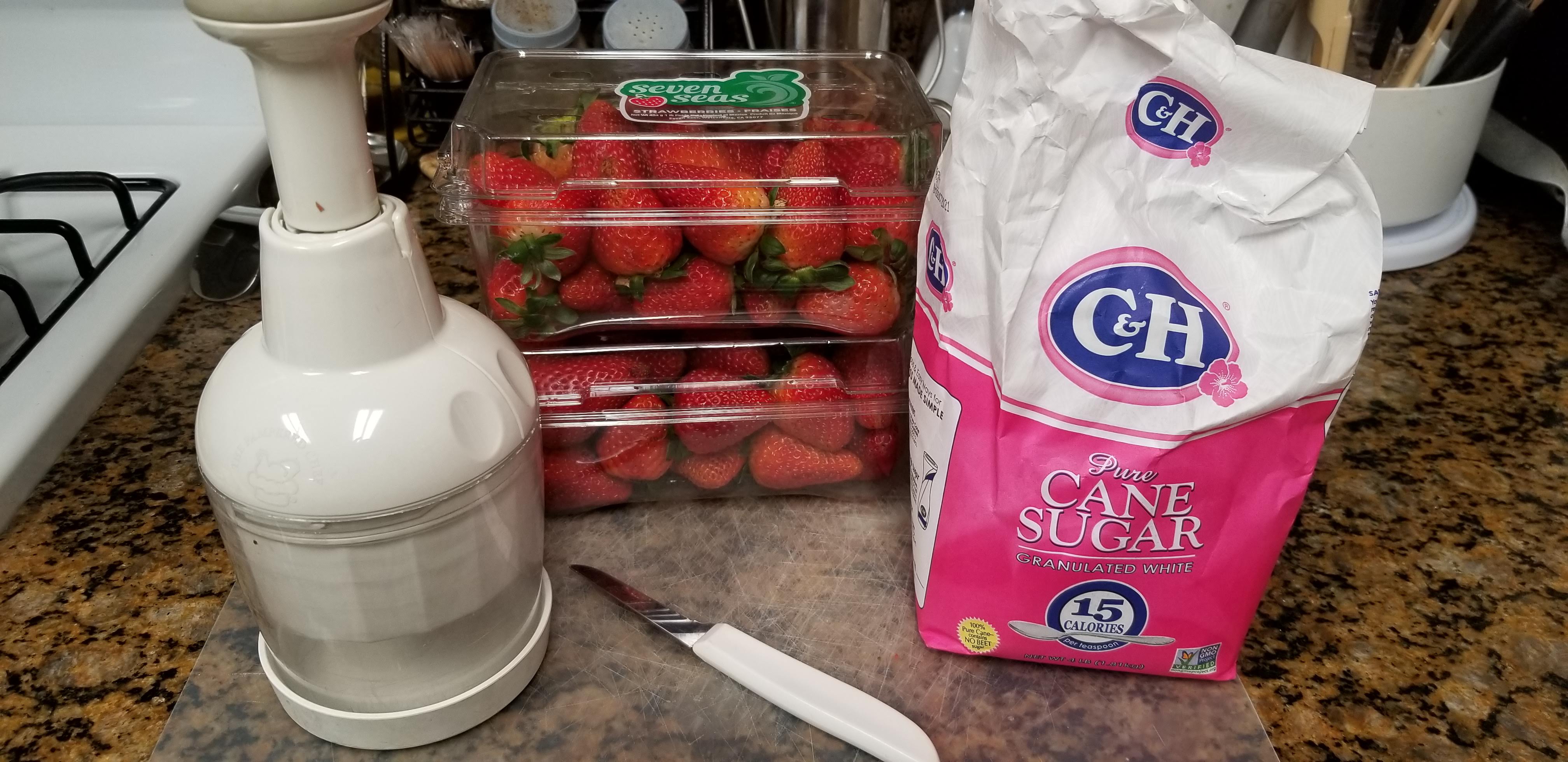 2 containers of Strawberries will equal 4 cups of chopped strawberries (Pampered Chef Food Chopper)