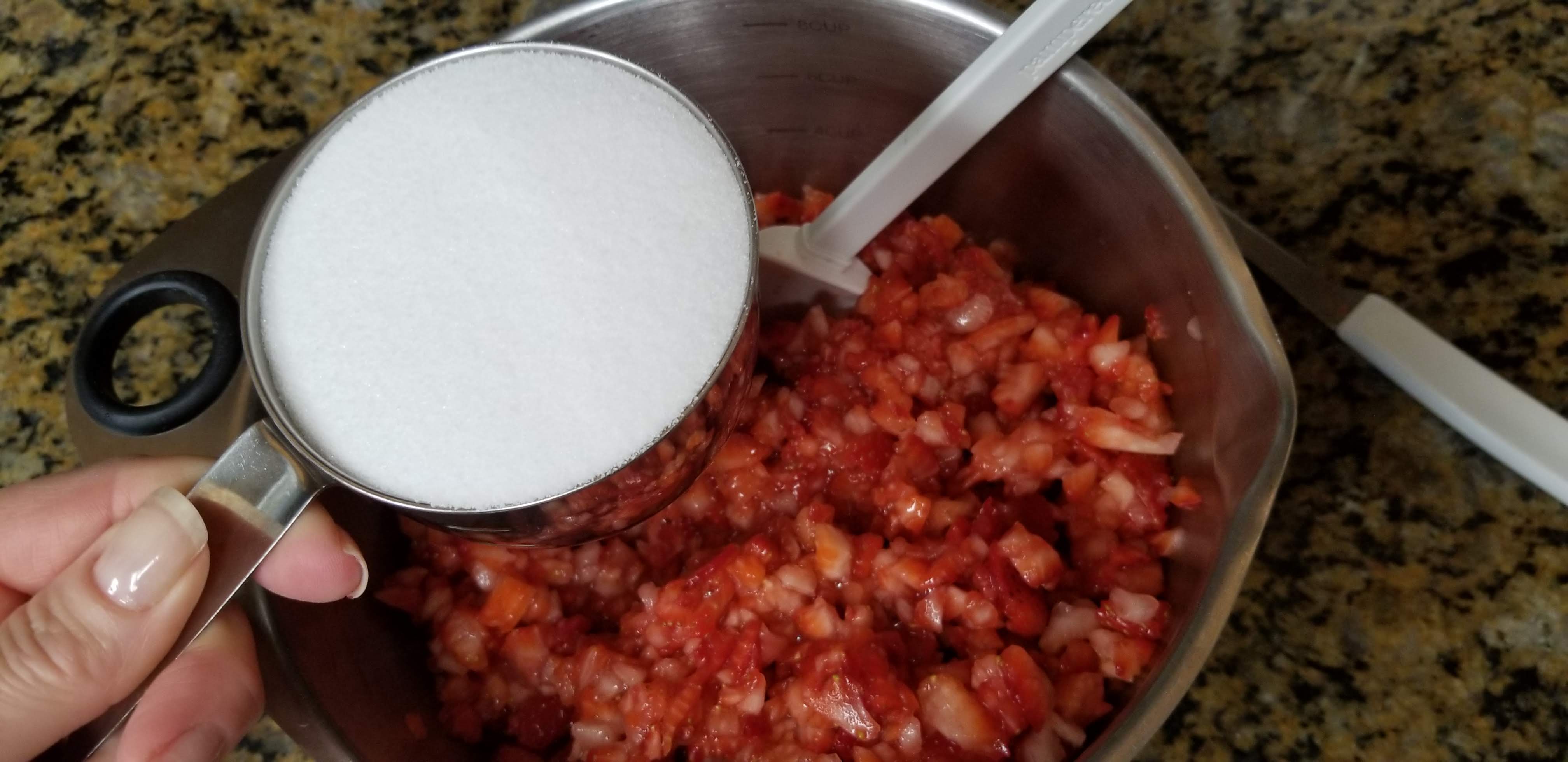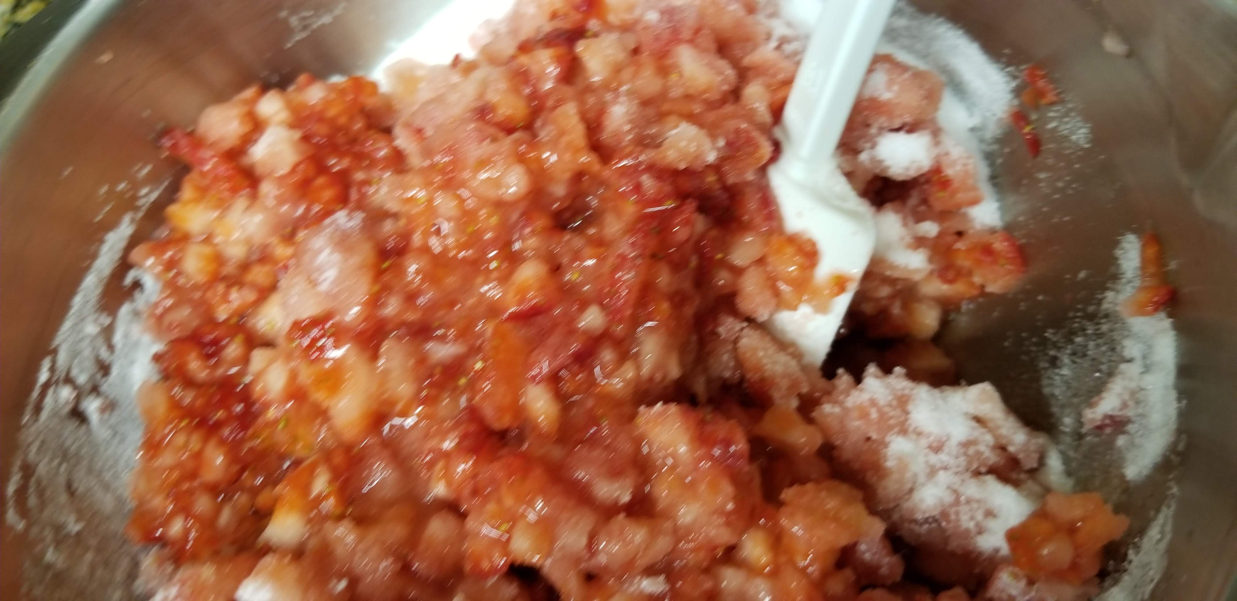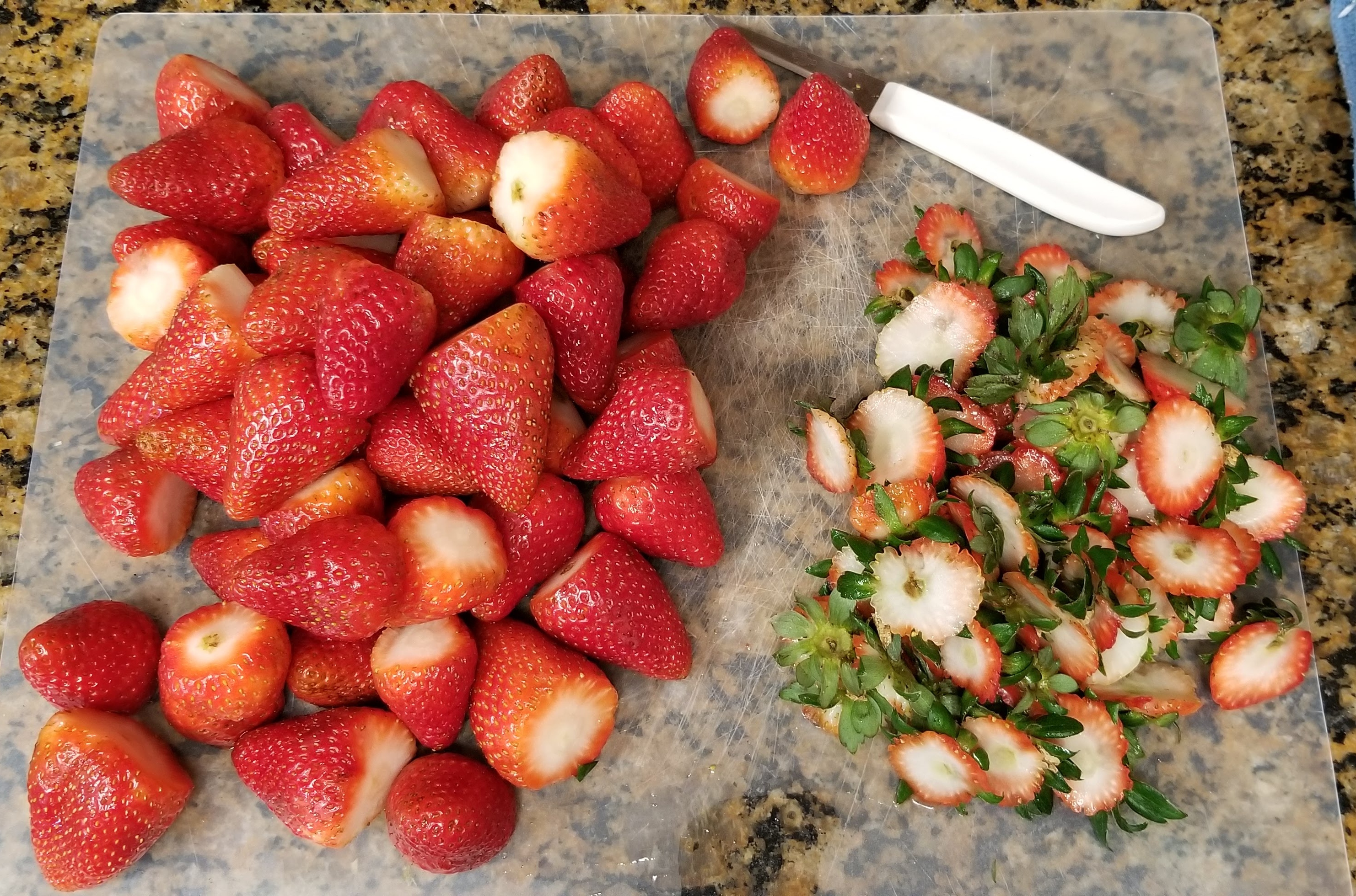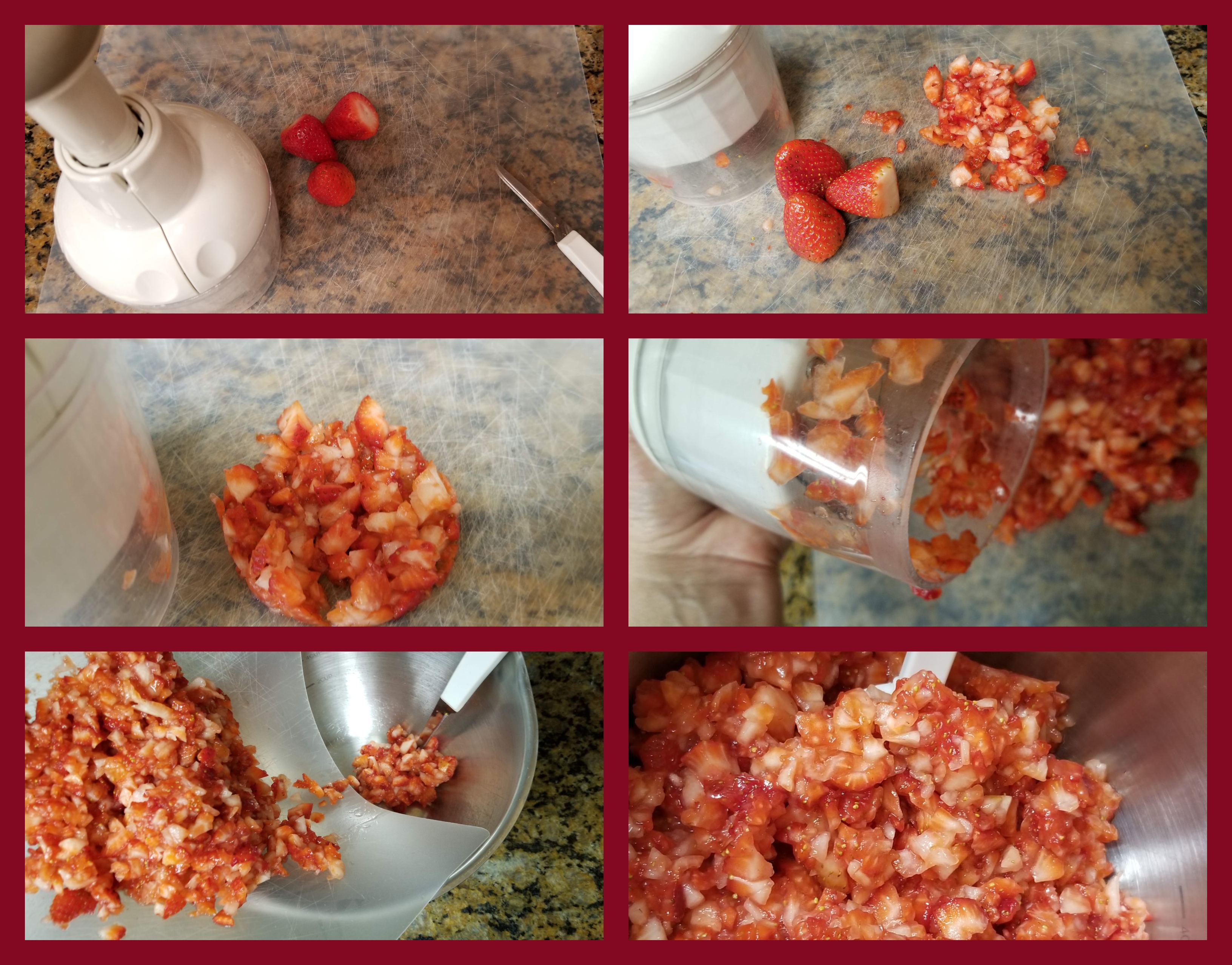 3. Add about three strawberries so they fit in the food chopper. You will want to chop them very fine (See Picture for size).