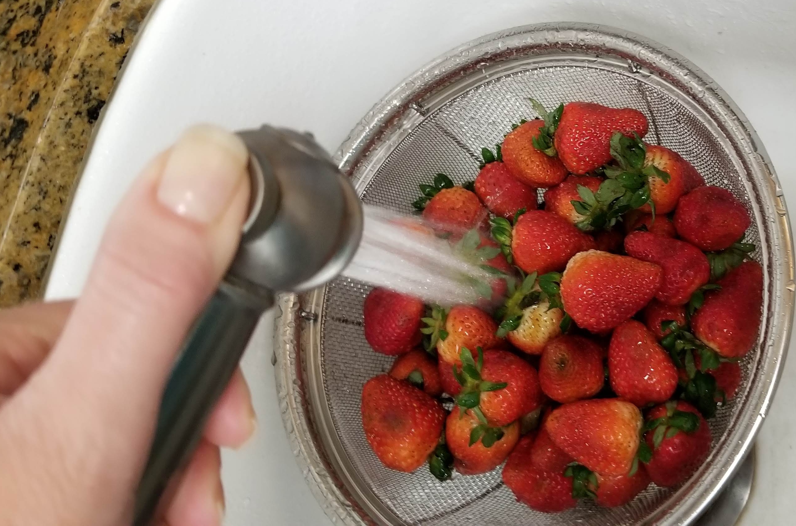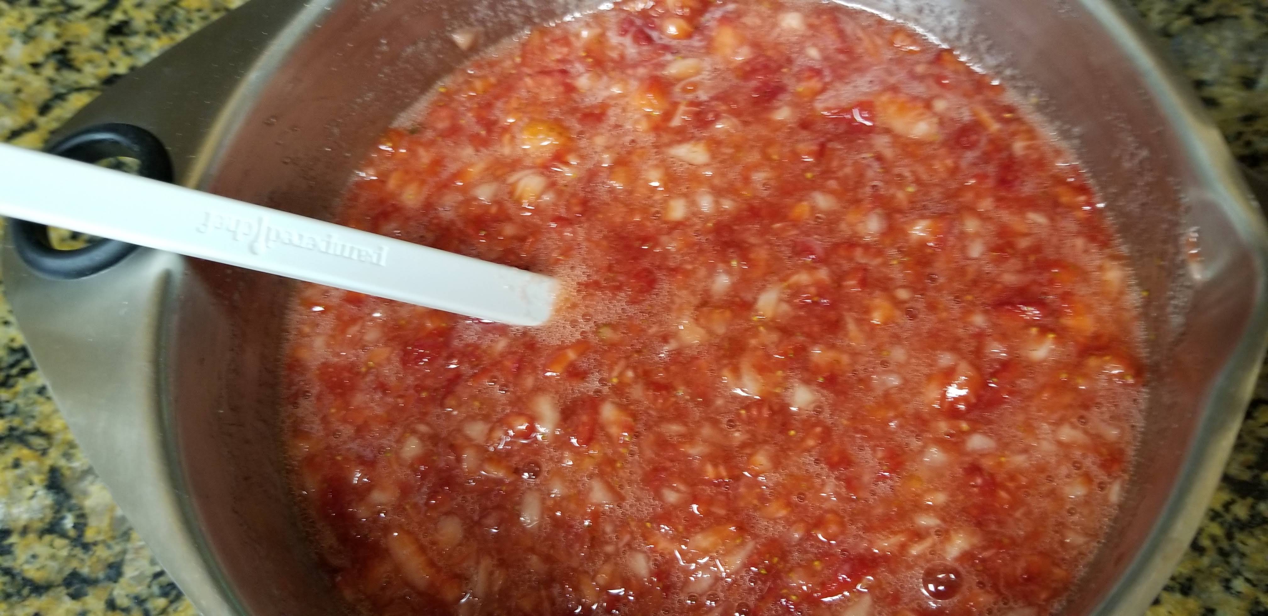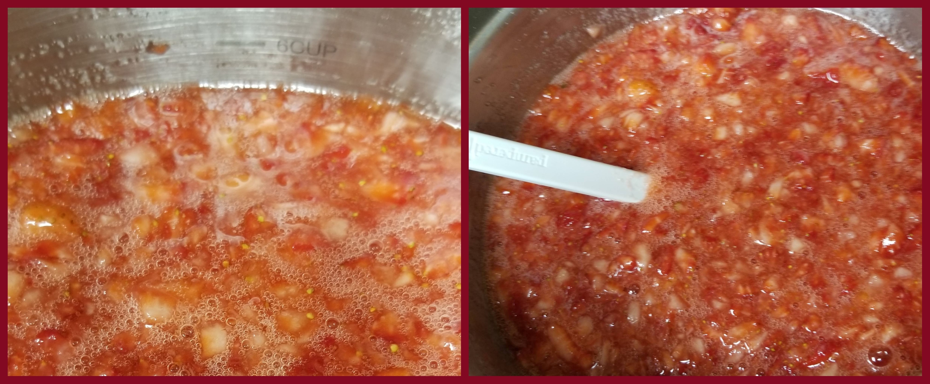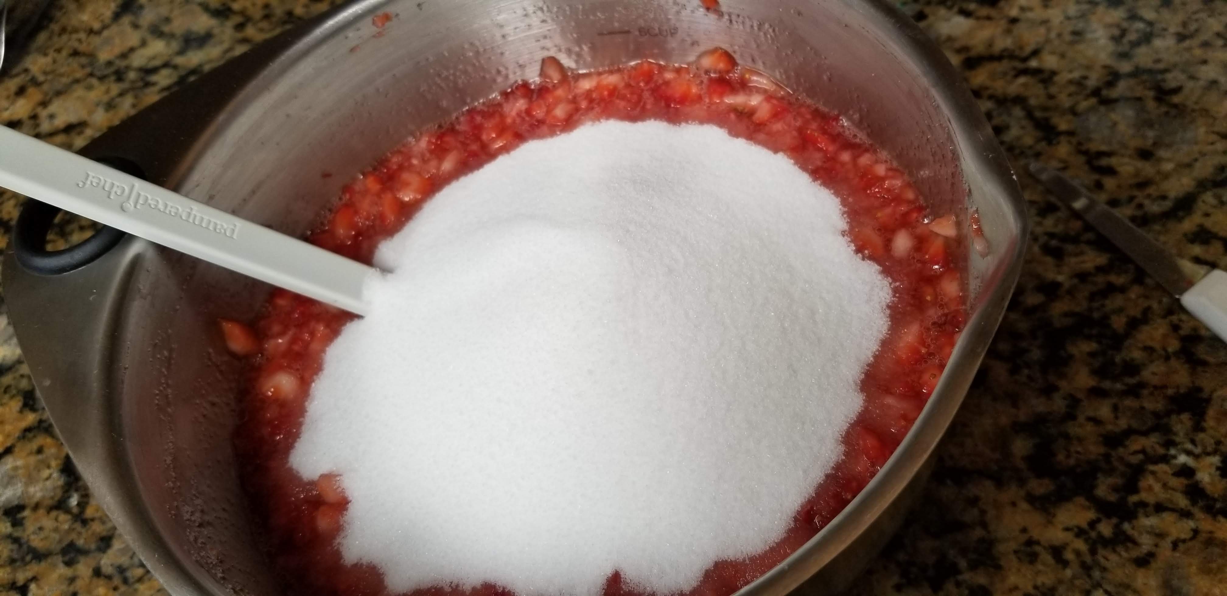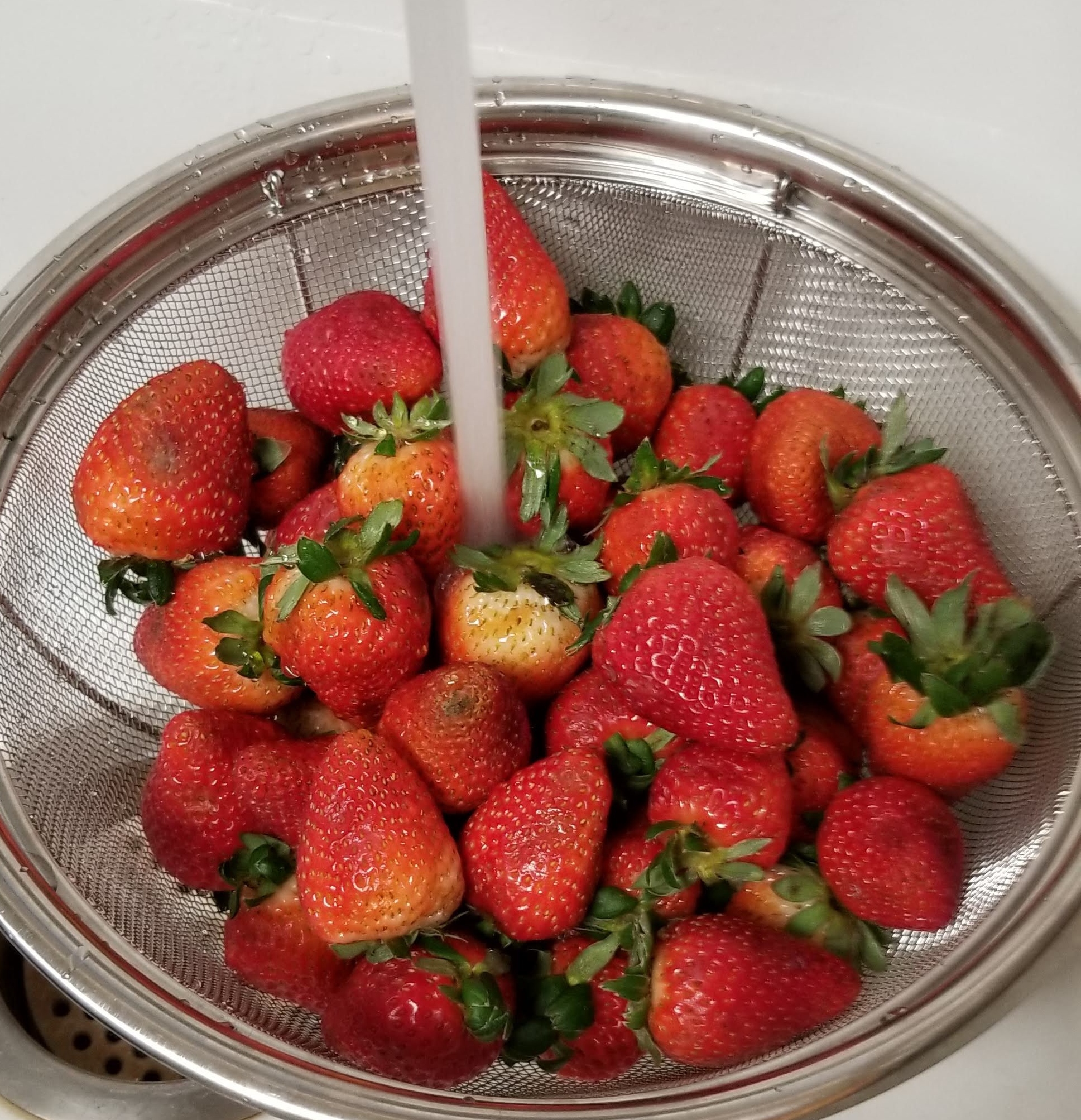 3. Add about three strawberries so they fit in the food chopper. You will want to chop them very fine (See Picture for size).