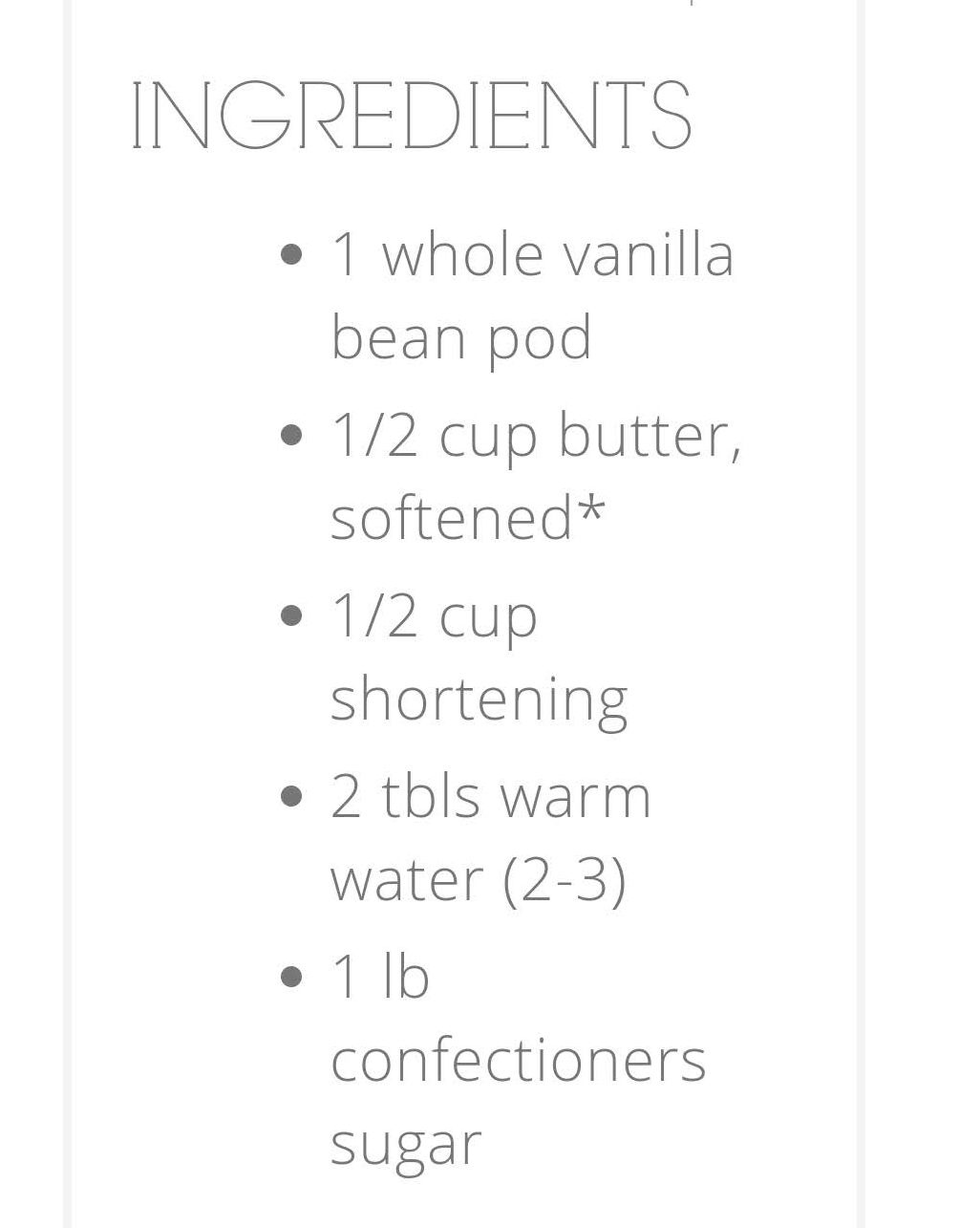 For the Frosting you will need to follow the Vanilla Bean Recipe Provided.